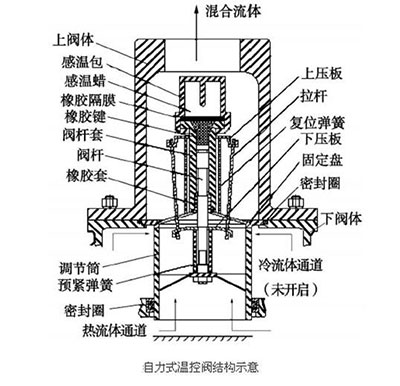 温控阀早期多为电磁温控阀,近年来通过对进口压缩机技术的消化吸收,蜡制温控阀应用也较多,此种温控阀由阀和控温原件两大部分组成。控温原件包括特种膨胀感温石蜡和紫铜壳体,在特定的相变温度下,膨胀石蜡的膨胀应力是一个定值,远大于恒温阀所需的推力。膨胀石蜡密封在壳体中,当温度上升到石蜡熔点时,体积膨胀而推动顶杆。使驱动控温阀的滑阀移动;温度下降时,石蜡遇冷收缩,在弹簧回弹作用下,阀门复位。这种温控阀特点:推力大,原件内部石蜡膨胀时能达到200多个大气压,行程温度曲线的线性好,因而控温能力强,元件刚性大,强度高,寿命长。
