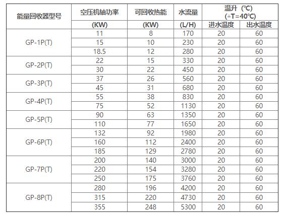 以平均轴功率160kw的喷油螺杆压缩机为例,每年可以回收热能:8.3*108KJ、折合燃油:70t、折合天然气:80250Nm3、折合燃煤:144t、折合标准煤:104t